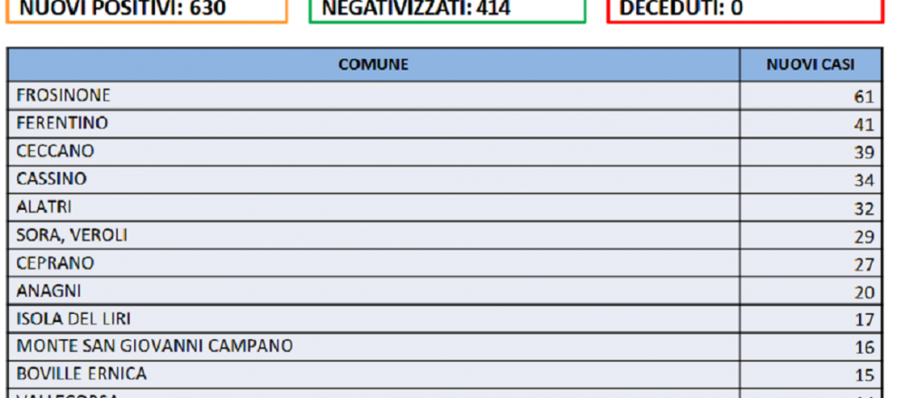 Emergenza Covid: in Ciociaria la buona notizia è che non ci sono decessi. 630 i contagi accertati dalla Asl di Frosinone. Alto il tasso di positività: al 21, 7 per cento. I guariti sono 414.