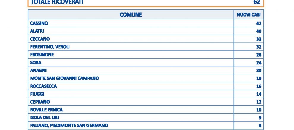 FROSINONE – 15 APR – Sono 497 i nuovi casi in provincia di Frosinone su 2.564 tamponi processati. Il tasso di positività è del 19%. Non risultano decessi. I guariti sono 644 i ricoverati 62. Cassino detiene il record giornaliero di contagi con 42, seguono Alatri con 40, Ceccano 33, Ferenrino e Veroli 32, 26 per Frosinone, 24 Sora, 20 ad Anagni. Da 19 ad un caso sono coinvolti altri 58 comuni.