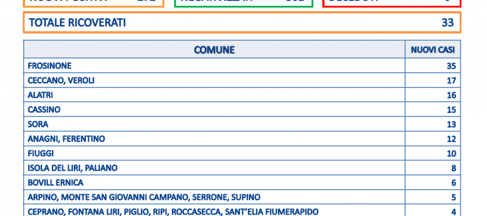 Nel dettaglio Frosinone conta 35 contagi, Ceccano e Veroli 17, Alatri 16, Cassino 15, 13 a Sora e poi altri 48 comuni coinvolti dal contagio ma con numeri inferiori.
