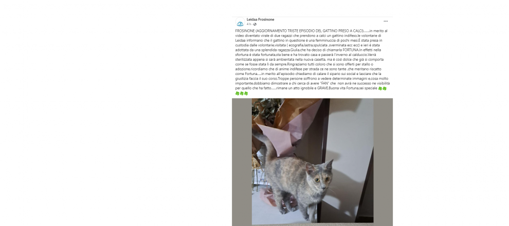 A darne notizia è l’associazione Leidaa Frosinone che   informa come il gattino, anzi, la gattina sia stata   presa in custodia dalle volontarie, visitata e  adottata da una  giovane, Giulia,  che ha deciso di chiamarla FORTUNA.