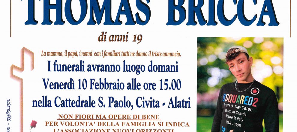 A presiedere i funerali di Thomas ci sarà  il vescovo della diocesi di Anagni e  Alatri Mons Ambrogio Spreafico.