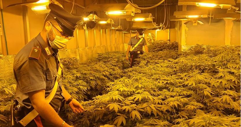 Un capannone, trasformato in serra, con dentro 512 piante di marijuana per un peso complessivo di 139 kg (al netto dei fusti ancora piantati).