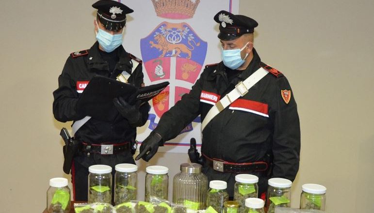 Nella sua abitazione è stato rinvenuto circa “mezzo chilo” di marijuana custodita in 10 buste in cellophane, e 34 grammi di hashish. I militari hanno trovato anche un bilancino di precisione,  materiale vario utilizzato per il confezionamento delle dosi e 1.645 euro suddivise in banconote di piccolo taglio, ritenuto – dai carabinieri – provento dell’attività di spaccio.