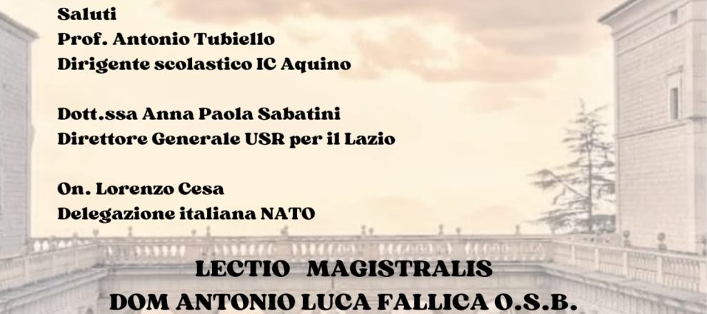 “La vocazione alla pace nella spiritualità benedettina, faro di civiltà per il territorio e per il mondo”: è il titolo della lectio magistralis che l’abate di Montecassino, Dom Antonio Luca Fallica, terrà giovedì mattina ad Aquino, nella sala conferenze della scuola primaria.