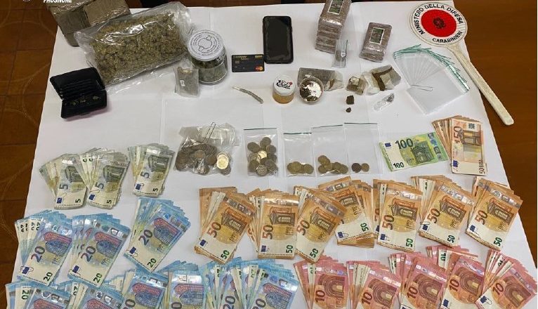 Nello specifico , il giovane veniva fermato dai militari operanti mentre era alla guida di un’autovettura e, nel corso dei previsti controlli, i militari operanti notavano che il giovane assumeva un atteggiamento nervoso ed agitato. Tale comportamento faceva insospettire gli operanti tanto che decidevano di sottoporlo a perquisizione personale e poi estesa anche al veicolo stesso. I sospetti divenivano certezze quando nel corso della perquisizione personale lo stesso veniva trovato in possesso di gr. 11 di stupefacente del tipo “hashish” ed uno spinello. Tenuto conto del permanere dello stato di agitazione del giovane e di quanto rinvenuto nel corso di una prima perquisizione personale e veicolare, la perquisizione veniva estesa anche presso la sua abitazione (eseguita anche con il supporto dei militari della Stazione di Piedimonte San Germano ) ove veniva rinvenuto, abilmente occultato all’interno di un mobiletto in ferro, chiuso da un catenaccio e sito nella sua camera da letto, ulteriore sostanza stupefacente del tipo “hashish”(per un peso complessivo di circa kg 1 e suddivisa in 9 panetti), infiorescenze di “marijuana” (per un peso complessivo di gr. 165), un involucro contenente gr. 6 di “marijuana” nonché la somma in denaro contante di circa Euro 11mila, ritenuta frutto delle attività di spaccio, nonché materiale ritenuto idoneo per il confezionamento della sostanza stupefacente. Quanto rinvenuto veniva sottoposto a sequestro.