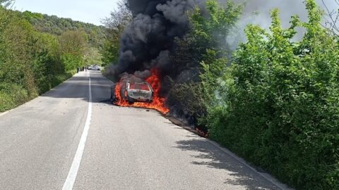 Hanno fatto appena in tempo a scendere e a mettersi in salvo gli occupanti dell’auto completamente divorata dalle fiamme. È