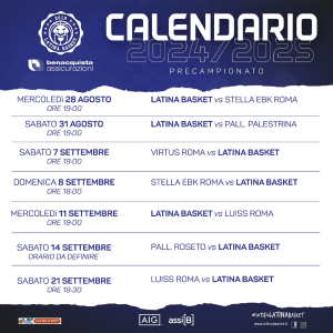 La formazione pontina, dopo i primi dieci giorni di allenamenti, disputerà già a fine agosto le prime amichevoli: mercoledì 28, infatti, ospite della Benacquista Assicurazioni sarà la Stella-EBK Roma, squadra guidata da Alessandro Finelli che parteciperà al campionato di Serie B Interregionale. A chiudere il mese sarà invece lo scrimmage casalingo di sabato 31 agosto con la Palla-canestro Palestrina, anch’essa prossima protagonista della Divi-sion F Conference Centro della Serie B Interregionale. Il mese di settembre si aprirà con 4 partite in una settimana per i nerazzurri che il weekend del 7 e 8 saranno protagonisti nella Capitale, ospiti rispettivamente della Virtus Roma, squa-dra neopromossa in Serie B Nazionale e che sarà quindi anche av-versaria in campionato, al PalaTiziano, e della StellaEBK Roma, presso la EBK Arena. Mercoledì 11 settembre sarà poi la volta della sfida casalinga contro gli universitari della LUISS Roma, cui seguirà la trasferta in terra abruzzese dove, sabato 14, la Benacquista affronterà la Pallacanestro Roseto di Coach Franco Gramenzi. L’ultima amichevole prima dell’inizio ufficiale del campionato, previsto per domenica 29 settembre a Chieti, si di-sputerà ancora nella Capitale sabato 21 settembre, questa volta per rendere la visita alla LUISS Roma.