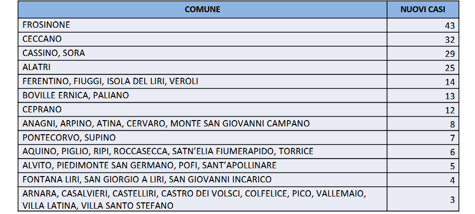 Il comune con più contagi è Frosinone, 43. 32 a Ceccano. 29 a Cassino e Sora.