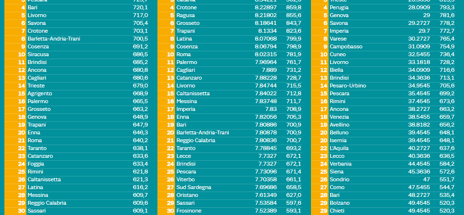 Latina segue in 27esima posizione con una temperatura media di 16,23 C°. La variazione in dieci anni è stata di +0,14%. Più indietro le altre province del territorio. Frosinone è 47esima con una temperatura media di 14,35 C°. Qui c’è stato l’aumento medio minore nel Lazio, pari allo 0,8%. Viterbo è 50esima con una temperatura di 14,56 C°: in dieci anni la variazione è stata di un +0,15%. Rieti è 54esima assoluta con una temperatura media di 14,29 C° e con un aumento dello 0,18%.