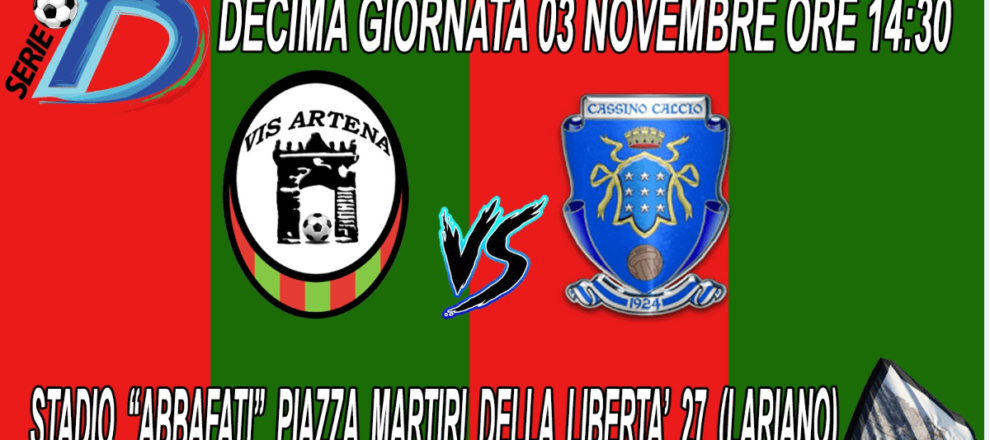 ARTENA – 30 OTT – La decima giornata di Serie D vedrà il Cassino di mister Urbano scendere in campo domenica contro la Vis Artena . Il match però verrà disputato presso lo Stadio Comunale “Abbafati” di Lariano perché il Comunale di Artena ancora non è pronto per ospitare le gare casalinghe della prima squadra dopo il lungo restyling.
