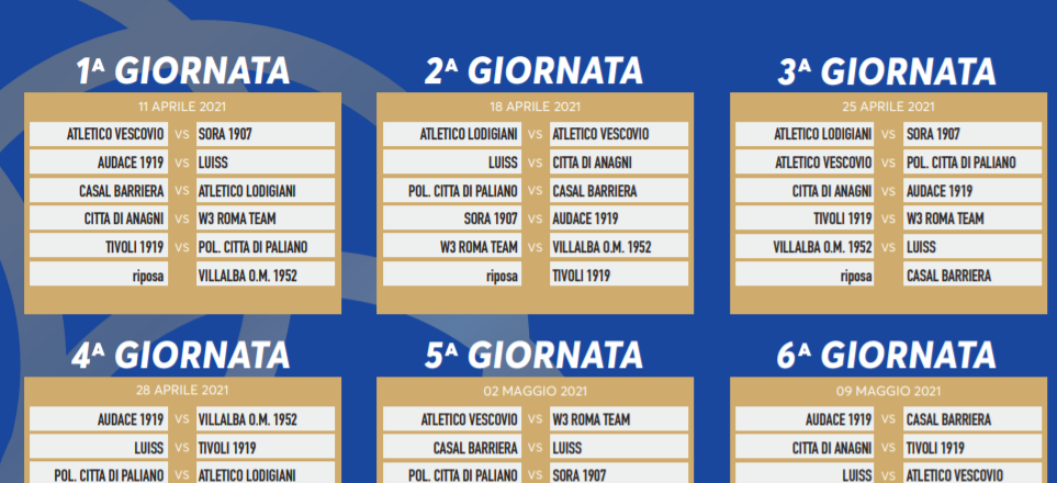 Il derby ciociaro si avrà alla quarta giornata tra Sora e Anagni fissata al 28 aprile. Il due maggio toccherà ad un altro derby tra Paliano e Sora. Il 30 maggio lo scontro tra le due confinanti: Anagni-Paliano.