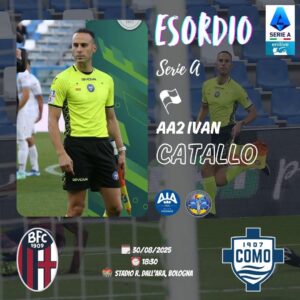 La seconda giornata di serie A sarà anche quella dell’esordio nella massima serie per l’assistente frusinate Ivan Catallo che sarà in campo allo stadio Dallara nella sfida tra Bologna e Como in programma sabato 30 agosto alle ore 18.30. Promosso nel 2023-2024 nella CAN1 per Iaboni si tratta della prima gara in serie A dopo due stagioni tra serie B, C e Primavera1.