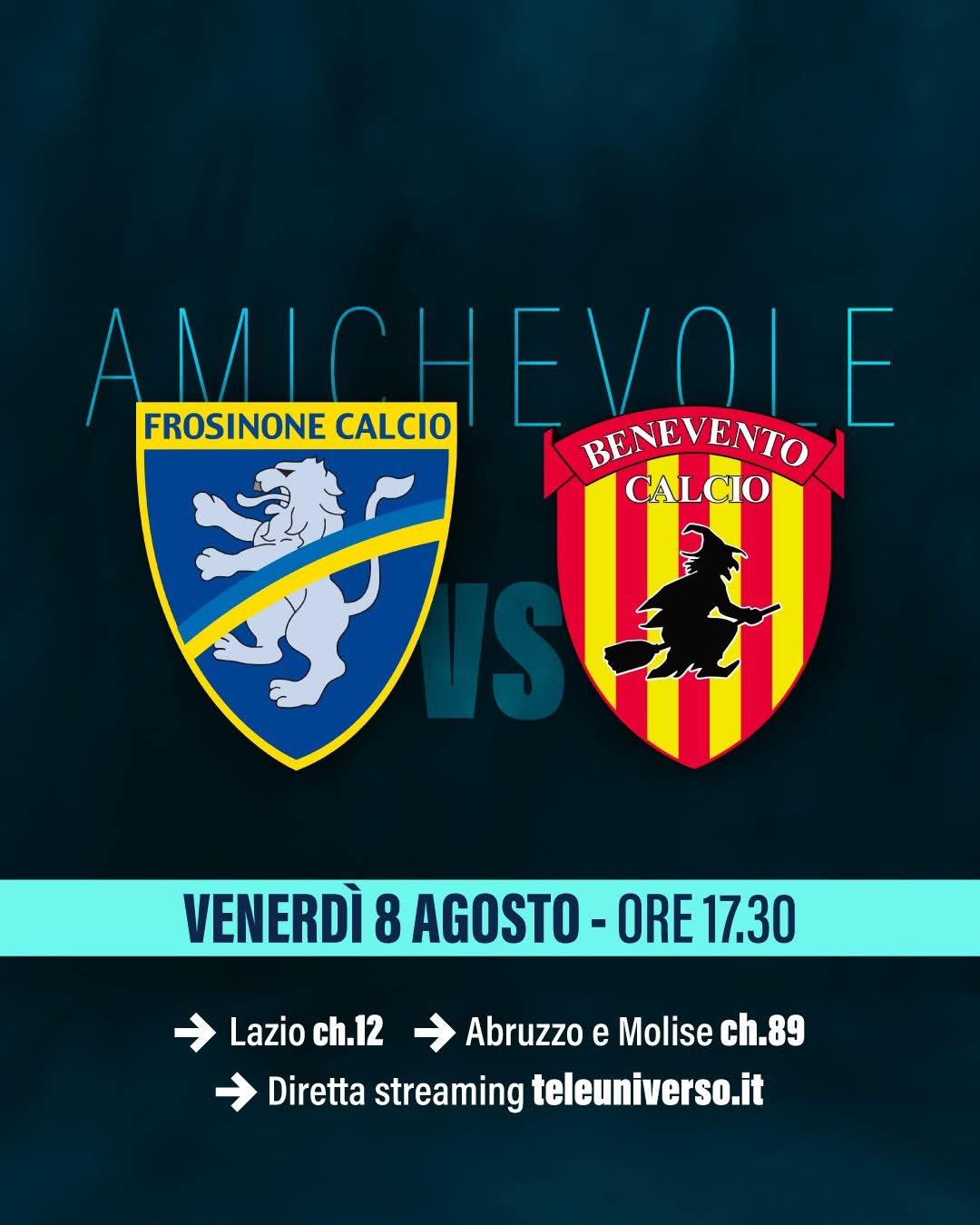 La gara amichevole Frosinone-Benevento, che si giocherà a porte chiuse a Ferentino venerdì 8 agosto 2025, con inizio alle ore 17.30, sarà trasmessa in diretta su TeleUniverso (canale 12 dgt) e in streaming su teleuniverso.it.