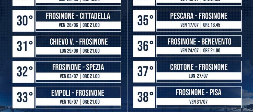 FROSINONE – 12 GIU – Ecco le date ufficiali: la Lega di Serie B ha diramato il calendario delle ultime gare rimaste in sospeso a causa dell’emergenza sanitaria in Serie B. Il cammino del Frosinone ora è ben delineato con date ed orari per le prime otto partite.