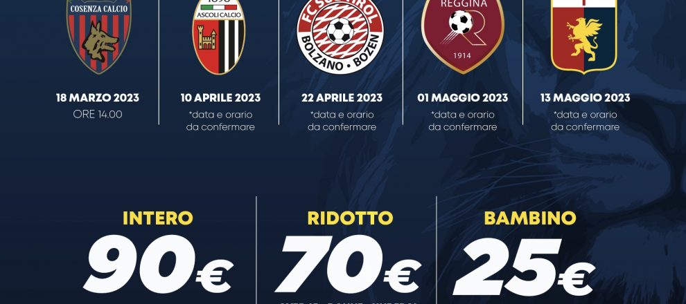 Per i match contro Cosenza, Ascoli, Sudtirol, Reggina e Genoa si potrà acquistare uno special pack al costo di € 90 Intero, € 70 Over 65, Donne, Under 16 e Disabili < 100% ed € 25 da 3 a 6 anni compiuti.