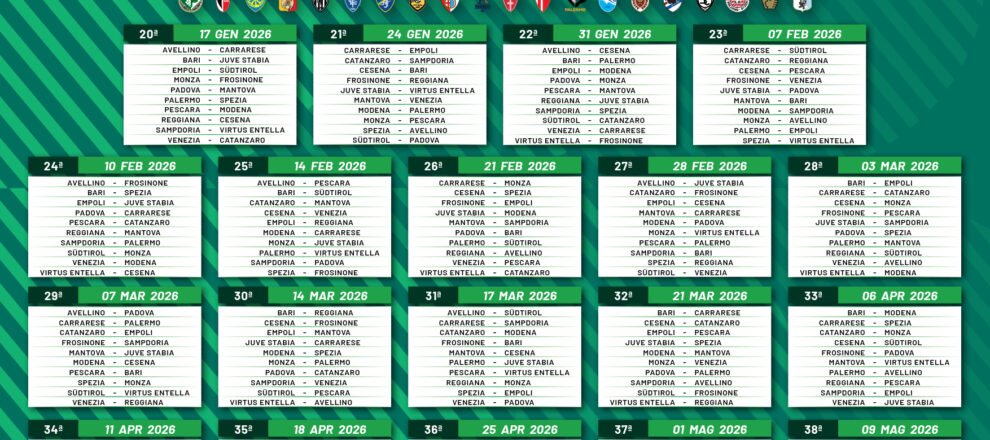 Alla nona giornata e alla sedicesima le sfide con il Monza dell’ex Bianco e il Pescara dell’ex Vivarini. Quattro le soste per gli impegni delle nazionali, e cinque i turni infrasettimanali. Ultima giornata di regular season in programma il 9 maggio.