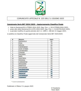Ora è scritto nero su bianco, in modo da non lasciare dubbi e spazio a interpretazioni fantasiose. La Lega Nazionale Serie B ha pubblicato la classifica finale aggiornata del travagliato campionato 2024/25, dopo la rinuncia al ricorso del Brescia.