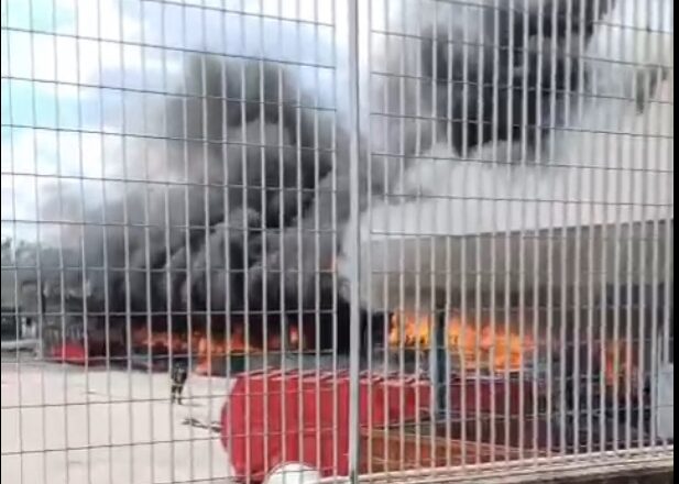 Le fiamme hanno generato una colonna di fumo nero visibile anche dai comuni vicini e dall’autostrada. Secondo le prime informazioni l’incendio sarebbe divampato da uno dei magazzini esterni.