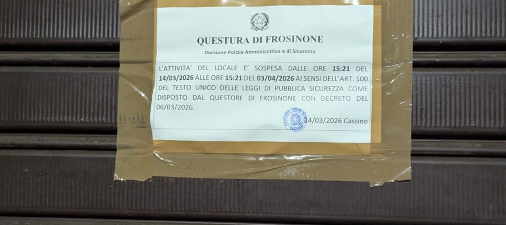 Il Questore   di Frosinone Stanislao Caruso ha disposto la sospensione per venti giorni della licenza di un locale in pieno centro a   Cassino.