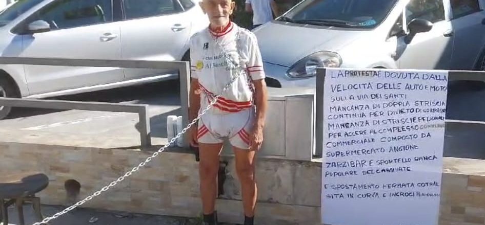 Il Signor Giovanni che vediamo nelle immagini con una corda attaccata al corpo si è letteralmente legato ad un palo dell’illuminazione posto lungo la trafficata arteria che conduce non solo a Sant’Angelo ma che fa da collegamento con l’intera valle dei santi. E il signor Giovanni chiede con una protesta singolare che le istituzioni facciano qualcosa per aumentare la sicurezza lungo la via dei santi, innanzitutto introducendo la doppia striscia continua che vieterebbe il sorpasso ma anche strisce pedonali per l’attraversamento di chi deve recarsi presso gli uffici o gli esercizi commerciali della zona.