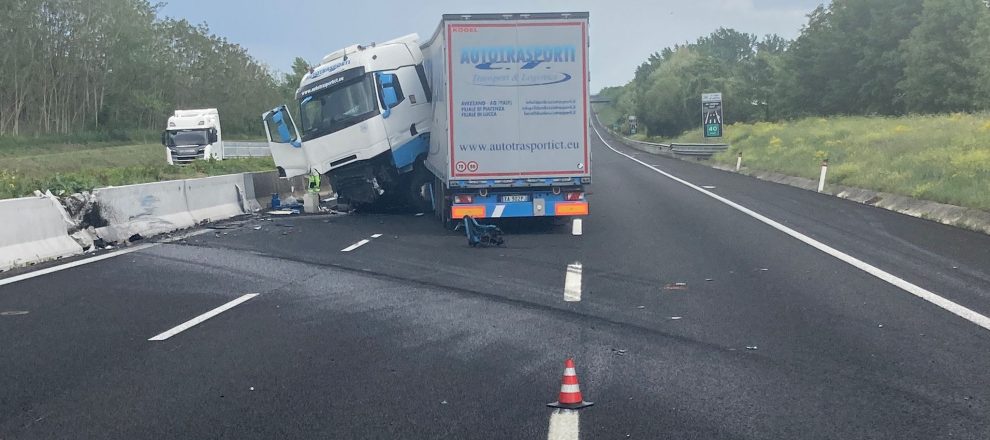 Il conducente dell’autoarticolato, che viaggiava sulla prima corsia, per cause al vaglio, ha perso il controllo dei veicolo che prima è finito contro il guard rail, distruggendolo, poi ha invaso le altre corsie, schiantandosi contro il new jersey che separa le due carreggiate.