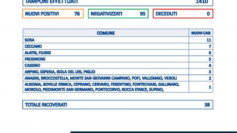 Covid – Sono 76 i nuovi casi in provincia di Frosinone su 1.410 tamponi. Il tasso di positività sale al
