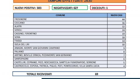 FROSINONE – 27 FEB – Sono 383 i nuovi casi in provincia di Frosinone ed un decesso. Si tratta di