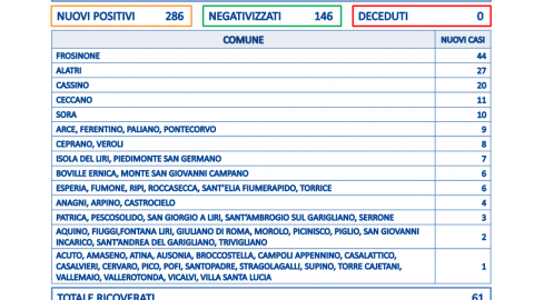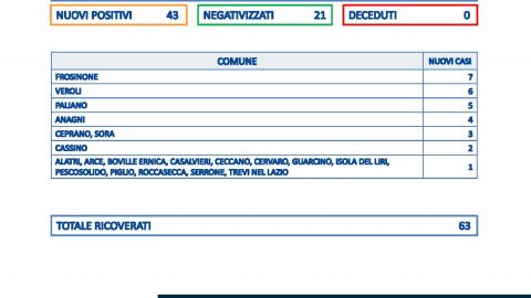 FROSINONE – 26 DIC – Sono 43 i nuovi casi in provincia di Frosinone su 230 tamponi processati. Il dato