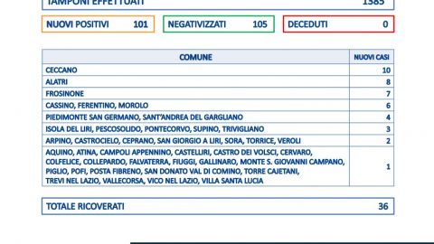 La provincia di Frosinone torna a quota 100, 101 per la precisione oggi i nuovi casi su 1.385 tamponi processati,