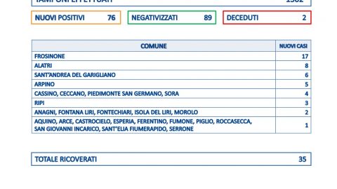 FROSINONE – 01 DIC – Sono 76 i nuovi casi in provincia di Frosinone e si registrano due decessi. Si