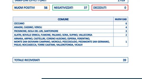 FROSINONE – Sono 56 i nuovi casi in provincia di Frosinone su 1709 tamponi processati. Il tasso di positività scende