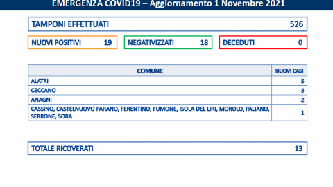 19 nuovi contagi in provincia di Frosinone a fronte di 526 tamponi processati nelle ultime 24 ore. Sale il numero
