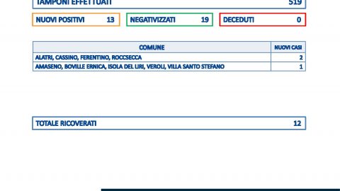 FROSINONE – Nelle ultime 24h sono stati effettuati 519 tamponi in provincina di Frosinone.Sono 13 nuovi casi di positivi al