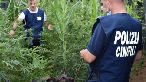 Cinquantacinque piante di marijuana coltivate in un terreno in zona Campo di Carne, ad Aprilia, nascosto dai campi di mais.