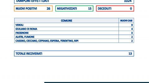 FROSINONE – Nelle ultime 24h sono stati effettuati 1024 tamponi. Sono stati registrati 26 nuovi casi di positivi al SARS-CoV-2.I