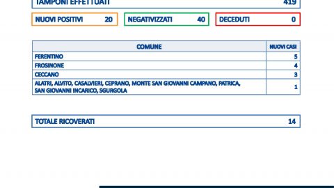 FROSINONE – 21 SET – Nelle ultime 24h sono stati effettuati 419 tamponi in provincia di Frosinone.Sono stati registrati 20