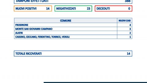 FROSINONE – Sono 14 nuovi casi su 388 tamponi processati. I negativizzati sono 23. Non risultano decessi.