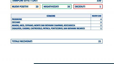 FROSINONE – 10 SET – Nelle ultime 24h sono stati effettuati 399 tamponi in provincia di Frosinone.Sono stati registrati 23