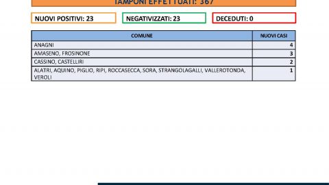 Nelle ultime 24h sono stati effettuati 367 tamponi in provincia di Frosinone.Sono stati registrati 23 nuovi casi di positivi al