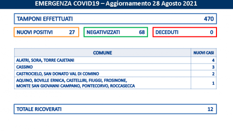 27 i nuovi contagi accertati sabato in provincia di Frosinone a fronte di 470 tamponi processati. Con un tasso di