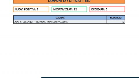 FROSINONE – Nelle ultime 24h sono stati effettuati 667 tamponi in provincia di Frosinone, sono stati registrati 5 nuovi casi