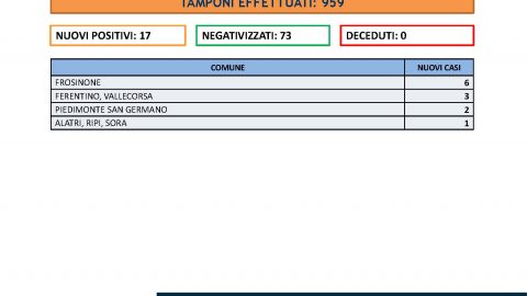 FROSINONE – Nelle ultime 24h sono stati effettuati 959 tamponi.Abbiamo registrato 17 nuovi casi di positivi al Sars-CoV-2.Sono 73 i