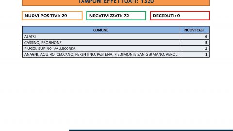 FROSINONE – Nelle ultime 24h sono stati effettuati 1320 tamponi. Abbiamo registrato 29 nuovi casi di positivi al Sars-CoV-2. I