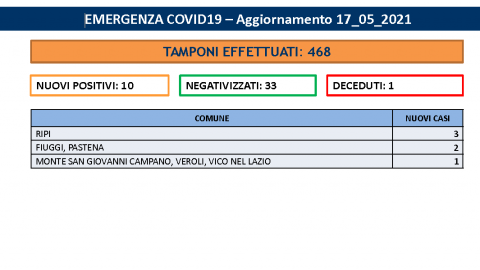 Nelle ultime 24h sono stati effettuati 468 tamponi in ciociaria che hanno accertato 10 nuovi casi di positivi al Sars-CoV-1.