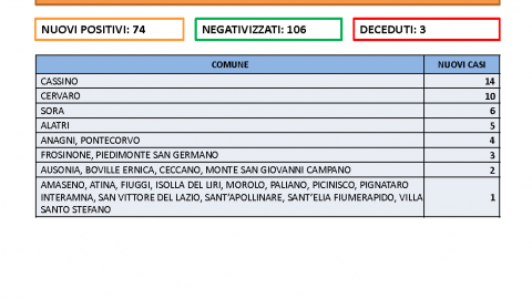 Numeri in discesa in provincia di Frosinone confermati anche dal bollettino odierno: su 1851 tamponi processati si contano 74 positività