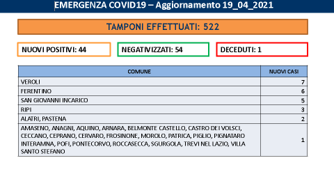 Pochi tamponi quelli eseguiti nelle ultime 24 in ciociaria: 522 in tutto e che hanno accertato 44 nuove positività al
