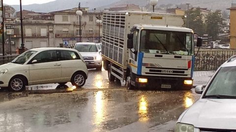 Traffico in tilt nel pomeriggio a Pontecorvo, all’altezza del ponte sul Liri: un camion è rimasto con una ruota incastrata