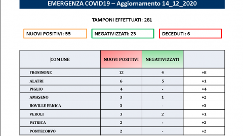 Il Covid non si ferma in Ciociaria. I nuovi positivi sono 55 ma su appena 281 tamponi. Il rapporto è