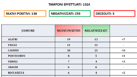 Sono 136 i nuovi positivi in Provincia di Frosinone al Covid 19: i tamponi effettuati sono stati 1314. Il rapporto