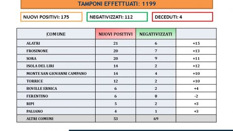 Un nuovo balzo: 175 i casi registrati nelle ultime 24 ore in provincia di Frosinone, su un totale di 1199